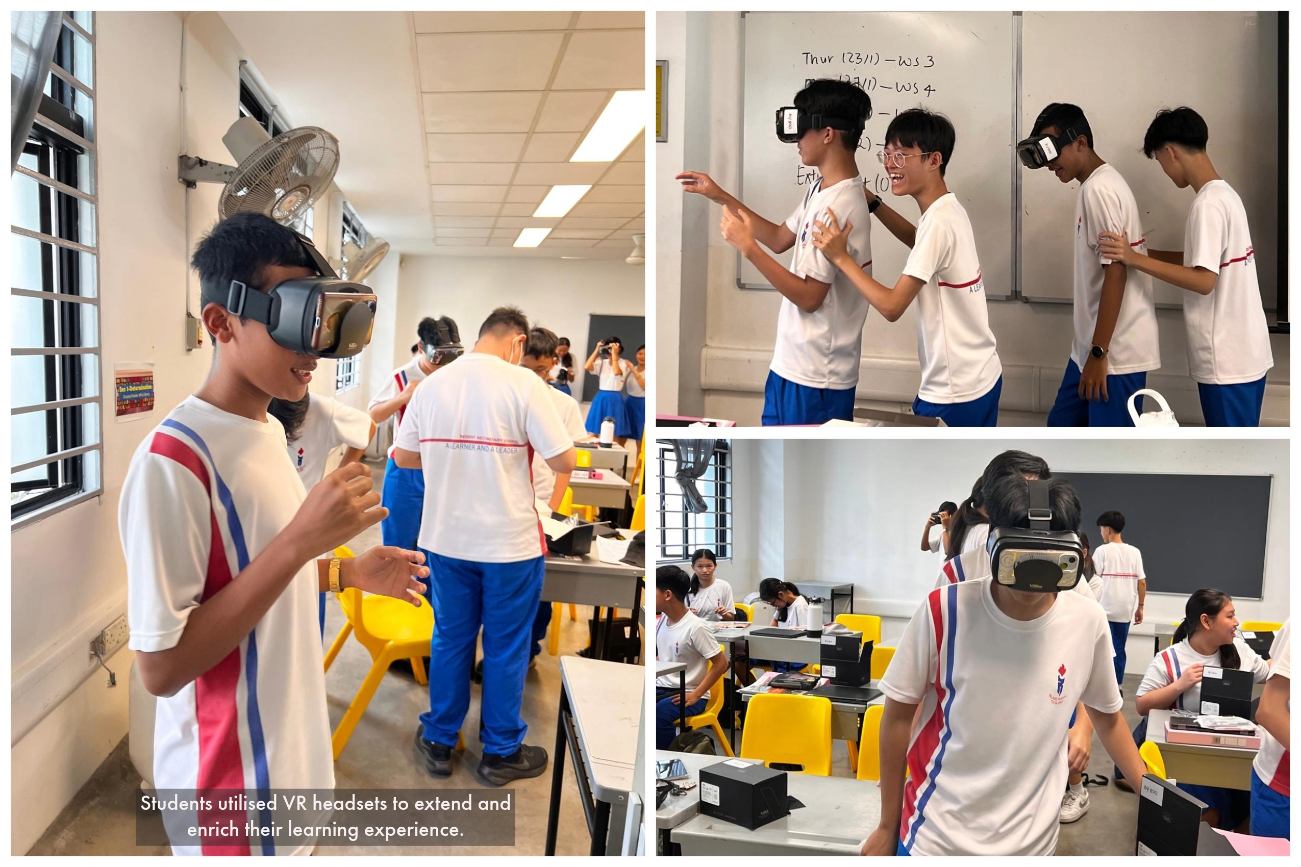During English Language lessons, students use VR goggles to immerse themselves in exciting scenarios. They practice Oracy skills by narrating their virtual experiences of extreme sports like skydiving or surfing and improve writing by exploring virtual heritage tours to landmarks like the Eiffel Tower to craft their descriptive essays. This immersive approach makes learning engaging and practical.